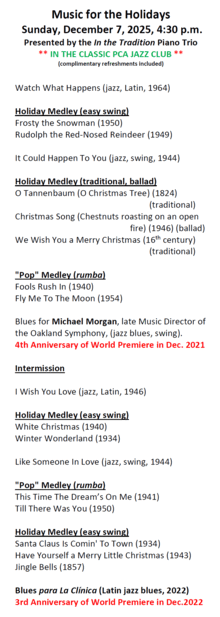 UP TO DATE VACCINATIONS RECOMMENDED, MASKS STRONGLY ENCOURAGED IN MAIN HALL! The IN THE TRADITION Piano Trio PRESENTS: (Bill Jackman - Piano, Michael Jones - Bass, Albert Brooks, M.D. - Drums). ** IN THE INTIMATE PCA CLASSIC JAZZ CLUB ** (complimentary refreshments included) Music for the Holidays! December 7, 2025, 4:30 PM