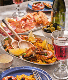 Enjoy: Bites, salad, paella, dessert and wine.