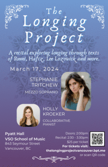 Join mezzo soprano Stephanie Tritchew, and pianist Holly Kroeker as they explore the sublime nature and broken-heartedness of longing.