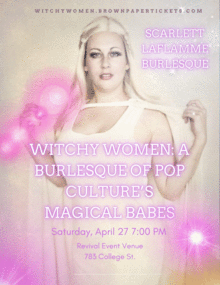 Of course, a person of any gender can be a witch, but witchcraft is historically and culturally most strongly associated with women. Witches are women who fight back. Patriarchal societies have long been terrified of the power and empowerment of women, seeking to control, marginalize, and demonize our knowledge, our sexuality, our wills our magic. Well, we say f**k that! On April 27, a cast of badass burlesque babes is bringing you a proper celebration of witchy women! Come be enchanted by a lineup of pop culture's iconic superheroes, supervillains, sorceresses, and supernatural heroines in an unforgettably magical evening at beautiful Revival Event Venue! Whether these characters use their powers for good, evil, or something more complicated, you're sure to love the spell this show will put you under!