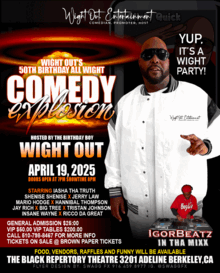 Wight Out Ent presents Wight Outs 50th Birthday All White Comedy Explosion Saturday April 19th 2025 at The Black Repertory Theatre 3201 Adeline Berkeley,Ca doors open at 7pm showtime 8pm