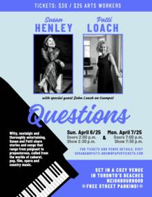 Described as witty, nostalgic and thoroughly entertaining, Susan and Patti share stories and songs that range from poignant to preposterous, culled from the worlds of cabaret, pop, film, opera and country music.