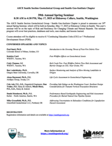 The ASCE Seattle Section Geotechnical Group/ Seattle Geo-Institute Chapter is proud to announce our 38th annual Spring Seminar, which will be held on Saturday, May 17, 2025 at Hideaway Cellars in Seattle. This years seminar will be on the topic of Risk and Resiliency for Changing Climate and Natural Hazards. The seminar program will cover best practices, databases and tools, case studies, and lessons learned.