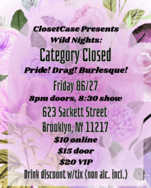 Category is....establishing queer artistry during pride! ClosetCase is back at it again with another pride performance for the ages! We'll have queer artists galore both in our vendor station, and on our stage! We will have sideshow artists, drag, burlesque, and most of all, some real gay shit. Raffle prizes will be given out at the end of the show, and all ticket holders will receive $1 off their beverages throughout the night (including sober options). Online tickets are $10, and door tickets will be $15. VIP tickets are $20 and come with a raffle ticket, priority seating in our front row, and a picture of our host, Adoration! Pride was never about being quiet, so let's get loud!