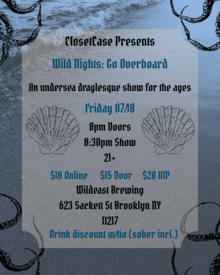 Avast sailors! ClosetCase is here to keep you wet with our sexy sea shanties and siren songs. Take a dip in the cool, mystical waters here at Wildeast Brewing on July 18th at 8 pm. Drink an ale, watch drag performers and burlesque performers dazzle you the whole night long, and win a piece of booty....we mean the treasure kind we promise.