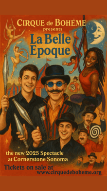 Cirque de Bohème was reimagined in 2008 by French-born artist Michel Michelis, following the success of his collaboration with the Red Moon Cabaret company in San Francisco. Around the same time, Pixar Studios and John Lasseter invited Michel to lend his voice to a new character in Cars 2 a French car, naturally. Since its creation, Cirque de Bohème has quickly distinguished itself as a premier French-American circus, celebrated for its unique blend of performance artistry, evocative storytelling, and innovative interpretations of vintage circus staging. Drawing inspiration from the French circuses of the early 1900s, the company is deeply rooted in Parisian traditions while capturing the spirit of Bohemian imagination and ingenuity. (Discover the full history of Cirque de Bohème on our website: https://cirquedeboheme.org/bio) The productions embrace a raw, authentic quality that is rarely found in contemporary circus. This realism, combined with poetic narratives, makes each performance timeless and profoundly relevant. Stories unfold through breathtaking acrobatics, magical illusions, whimsical humor, and moments of wonder. Steeped in the elegance of the 1920s French circus tradition, Cirque de Bohème invites audiences into a world of enchantment, adventure, and imagination. For 2025, Cirque de Bohème proudly presents its new show: La Belle Époque. This production brings together a world-class ensemble of international artistsmagicians, acrobats, contortionists, aerialists, hoop performers, and morefor a captivating spectacle filled with energy, artistry, and soul. Celebrate this cherished French holiday tradition in the beautiful gardens at Cornerstone, Sonoma. Each performance is an intimate experience, limited to just 110 guests, beneath our charming, vintage-style circus tent.