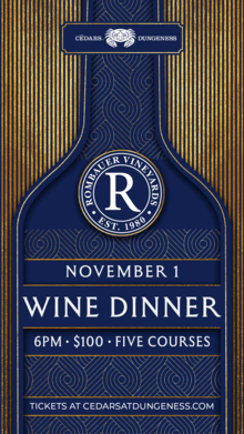 Join us at the Cedars at Dungeness Golf Course for another one of our delicious 5 course wine pairing dinners!