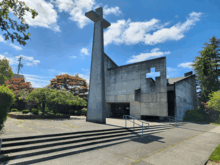 The church describes its building as "a modern sanctuary standing in sharp contrast to the traditional rectangular, long-nave building that preceded it. Thiry's admiration for Le Corbusiers seminal chapel of Notre-Dame du Haut in Ronchamp, France, is reflected in multiple design and construction elements. The use of plain, poured concrete is its most startlingly modern element. Yet, for all its modernity, the profound simplicity of its interior reflects the solemnity and severity of early Romanesque Christian basilicas."
