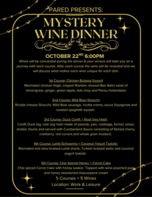 *The Mystery begins... 6:15PM Wines will be concealed during the dinner and your senses will take you on a journey with each course. After the food and wine are poured, the wine itself will be revealed and we will discuss what makes each wine unique for each dish.