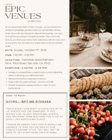 As an esteemed client of Epic Venues , you are invited to attend 2 tastings produced by our acclaimed culinary team. If you do not choose to attend this tasting, our next one will be occurring in February.This event will ensure you that your menu item selections will not only wow your guests, but exceed your expectations of our culinary staff!