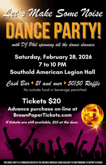 This dance party is a fundraiser hosted by the Southold American Legion Auxiliary, to fund programs to support Veterans.