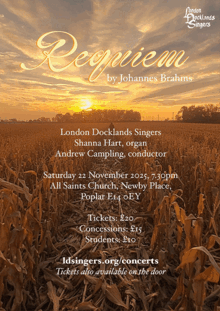 This autumn London Docklands Singers presents Johannes Brahms' Requiem in the beautiful surroundings of All Saints' Church, Poplar conducted by Andrew Campling.