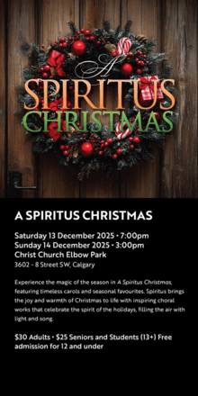 Experience the magic of the season in A Spiritus Christmas, featuring timeless carols and seasonal favourites. Spiritus brings the joy and warmth of Christmas to life with inspiring choral works that celebrate the spirit of the holidays, filling the air with light and song.