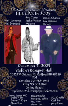 New Year's Eve Banquet and Show 12/31/2025 Neil Lawrence as Neil Diamond Rob Carter as Jackie Wilson/ Motown Dennis Charles as Roy Orbison/ Variety Dinner Buffet Dessert buffet Free Coffee, Tea, Juice, Pop Cash Bar Champagne toast at Midnight Party Favors 50/50 raffle