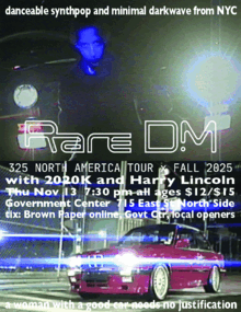 danceable synthpop and minimal darkwave from NYC RARE DM https://rare-dm.bandcamp.com/ https://soundcloud.com/rare_dm with special guests 2020K (queer pop and electronics) https://2020k.bandcamp.com/ Harry Lincoln (dark techno/IDM from Atlanta, now at CMU!) https://soundcloud.com/harrylincolnxo https://www.instagram.com/harry._.lincoln/