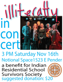 Illiteratty is a folk band on the traditional and unceded territories of the Squamish, Musqueam and Tsleil-Waututh peoples, also known as Vancouver, BC.
