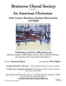 The concert will be followed by a reception with light refreshments. A silent auction and raffle will take place during the intermission and reception. See our webiste for descriptions of auction items. braintreechoralsociety.weebly.com Cash, check and credit card accepted for raffle and auction items