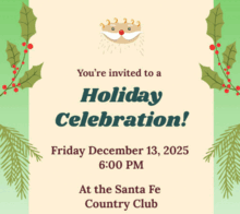 Come join us for our annual GOP Christmas Party at the Santa Fe Country Club on Friday, December 13th at 6pm  This site is to order your dinner.  All extras included in your price, including dessert.  We will have great food, entertainment and a very special pinata for everyone to enjoy.