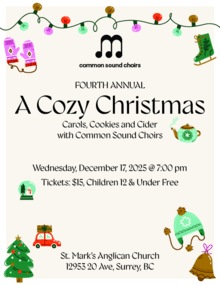 Join us for a night of Carols, Cookies, and Cider as we celebrate the Christmas Season! Featuring our Women's Choir, Chamber Choir, and Children's Choir. We hope to see you there!