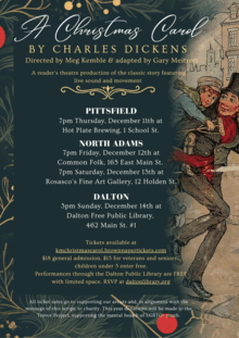 Join us this holiday season for a lively reader's theatre production of Charles Dickens' classic tale. An ensemble of five actors, all volleying between multiple characters, gives vibrant voice, movement, and live sound to this timeless story. Originally adapted by artistic Director Gary Meitrott for the Shakespeare on Main company, we are thrilled to revive this touring production for audiences in upper Berkshire county!
