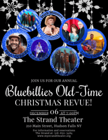 The Bluebillies 13th Annual Old-Time Christmas Revue! Featuring the host band The Bluebillies, the 2023 AND 2025 winner of the ListenUp Award for best country/folk band, who will present a fun and eclectic mix of original and classic Christmas songs that will make your holidays shine a whole lot brighter. And as usual The Bluebillies are bringing along a fabulous cast of guest performers: Off The Record Trio, 2022, 2023, & 2025 Thomas Edison Music Award Winner for Best Party Cover Band in the Capital District; Marc Delgado, Part folkie, poet, raconteur & stand-up comic. Marc's songs tell the stories & shares his experiences from dark to light & all the shadows in between; Kevin Harder (Elvis Tribute Artist) will join in again, as will up and coming country singer Zachary Slavers. Our emcee for the evening will be Mark Munzert, International Western Music Association 2024 Poet of the Year! Mark will bring his poetic parlance & rhymsical recitin' to make guests smile, laugh, tear-up, and ponder. Mark tells the stories & lessons of cowboy life, characters & character, tragedy & triumph.