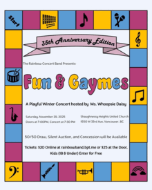 Join the Rainbow Concert Band as we celebrate 35 years of music, community, and fun with our winter concert Fun and Gaymes. Expect a lively mix of playful tunes, a dash of nostalgia, and plenty of musical surprises. Hosted by the fabulous Ms. Whoopsie Daisy, this evening promises laughter, warmth, and great company.