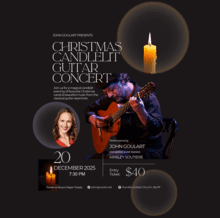 Join Award Winning Classical Guitarist John Goulart as he plays some of your favourite Christmas music in a unique Candle Light setting at the historic Rundle United Church in Banff. John will also perform many gems of the Classical Guitar repertoire in this evening of beautiful music. John's special guest is talented soprano Ainsley Soutiere who will join him singing Carols from South America, American Spirituals and beautiful Renaissance melodies. This concert promises to warm the heart and ring in the Christmas Spirit!