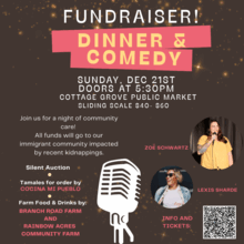 Join us for an evening of community care! Branch Road Farm Catering and Rainbow Acres Community Farm are hosting a fundraiser for our immigrant community being impacted by the kidnapping that is happening. We will be serving up a delicious farm food dinner and desserts, as well as have both non alcoholic drinks and cocktails available. In addition there will be a comedy show over dinner with Zoe Schwartz from PDX and Lexis Sharde from Eugene, getting our laughter flowing because laughter in these trying times is necessary medicine! There will be a silent auction of local goods for those last minute holiday gifts! Tickets are sliding scale and are $40-$60. This is for dinner/ dessert and the comedy show. Note the comedy may have some explicit context so parental discretion is necessary.