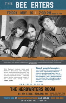 "chamber music's finely calibrated arrangements with bluegrass's playful virtuosity and pop music's melodic resourcefulness." -The Boston Globe "It is a joy to hear both the exploration of this music and the grounding of it simultaneously. Also, I love the emphasis on the simple beauty of the acoustic instruments." -Edgar Meyer (3 time Grammy-winning composer/MacArthur Fellow) "...here come the Bee Eaters. ...so tastefully arranged and so well played. They rescue the hammer dulcimer from all cliches, and bring the music forward to right here and now." -Tim O'Brien "The Bee Eaters are the instrumental cream of the brand new string nation." -Darol Anger