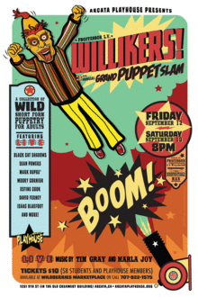 Puppets are not just for kids in this anything goes two night event of puppet mayhem. A gathering of local, Canadian and Portland puppeteers will storm the stage at the Arcata Playhouse for the third annual Professor Willikers' Grand Puppet Slam, a two night adult puppetry performance event taking place on Friday and Saturday, September 12 & 13 at 8:00 p.m. Presented in a cabaret format with live music by Tim Gray and Marla Joy, the evening is hosted by the indestructible puppet, Professor LV Willikers and the uncompromising Bobby Burns and features special guests and sets by Lush Newton and James Hildebrant. The performing roster includes local puppeteers David Ferney, Mark Dupre, Issac Bluefoot, Sean Powers and Black Cat Shadows as well as special guest performances by Canadians Mookie Cornish and Xstine Cook and Portland puppet company Teatro Calamari. Recommended for adult audiences the show promises a wild ride through a variety of different puppet styles and performers. The performances are sponsored by Playhouse Arts and the Puppet Slam Network which is a national network of short form puppetry performance www.puppetslam.com. "The Puppet Slam Network is a great resource with over 50 Slams across the country and in Puerto Rico and Canada represented. We are excited to be part of the nationwide fun." said Playhouse Puppet Slam producer and performer, David Ferney. "The slam is always a blast and loved by audiences." added Ferney.