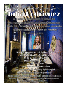Starring Julia Rodriguez, famous for her lead roles in Glendale Center Theater's "Thoroughly Modern Millie" and "Hairspray." She will delight you with her sparkling personality, comedy and versatile vocal styling. Accompanied by Larry Evans on piano, a well known Pasadena pianist whose published CD's are sold and downloaded all over the world. Just $18 get's you $10 credit towards dinner and plus the show is included. Have you looked at dinner theater prices lately? Enjoy a gourmet dinner with classy entertainment in one of the most beautifully decorated rooms in Pasadena. It reminded my friend Alison of the palace at Versailles in France. A one time only, one of a kind event for a very low price. Who could ask for more?