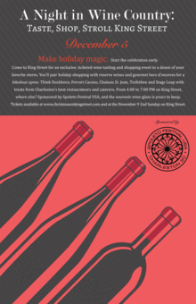 Start the celebration early. Come to King Street for an exclusive, ticketed wine tasting and shopping event in a dozen of your favorite stores. You'll pair holiday shopping with reserve wines and gourmet hors d'oeuvres for a fabulous spree. Think Duckhorn, Ferrari Carano, Chateau St. Jean, Trefethen and Stags Leap with treats from Charleston's best restaurateurs and caterers, like Caviar and Bananas, Ted's Butcherblock, Persimmon Cafe and Halls Chophouse.